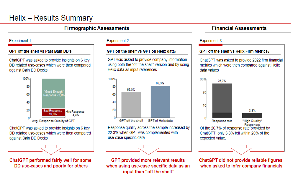 Bain study on Chat GPT’s Ability to Answer Common Due Diligence Questions. Approach includes conducting three experimental exercises to develop and test OpenAI applications for “live” use-cases. Contains methodology, process and findings.